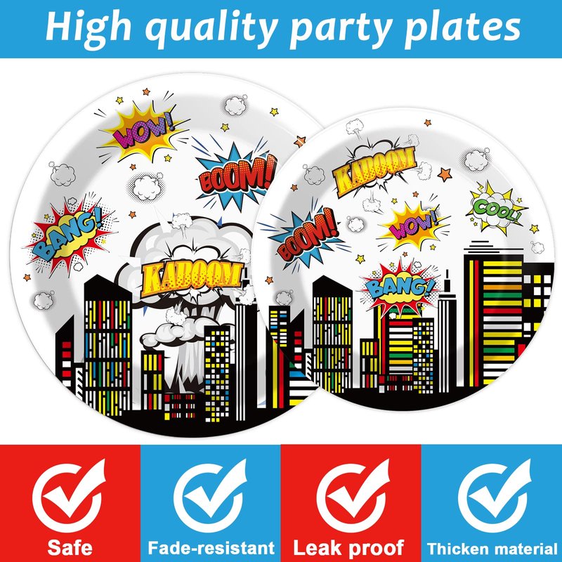 - 【Beautiful Design】There are building, onomatopoeia, colorful clouds. The pattern and color are well-printed and fade-resistant to provide you with a party that full of super theme hero atmosphere.