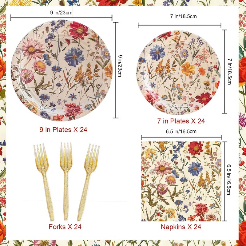 - Variety Pack: This 96-piece set includes 24 plates (9 in), 24 plates (7 in), 24 napkins (6.5 in), and 24 forks adorned with a vibrant wildflower print.