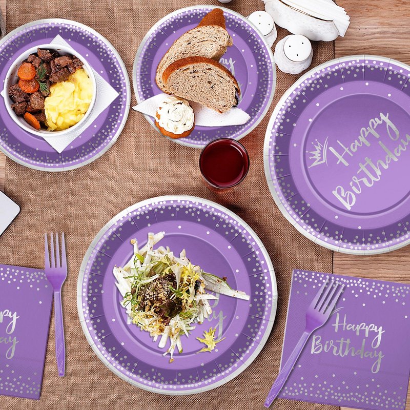 - Exquisite Design:This cutlery set comes in an elegant purple color,giving it an air of nobility and mystery. ,while the silver dotted and “Happy Birthday” pattern livens up the tableware,and elegant atmosphere for your birthday celebration.