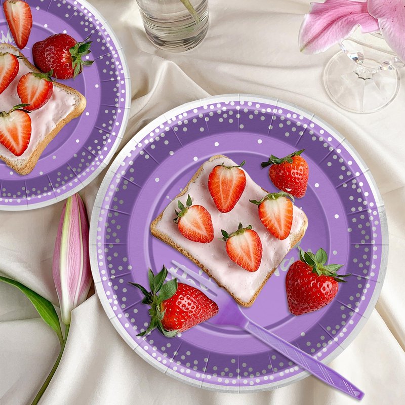 This elegant purple Silver Theme disposable birthday party supplies tableware set is not only stylish but practical,also eco-friendly and fully biodegradable,ensuring a worry-free dining experience,The set includes 7inch dessert plates,9inch dinner plates,napkins and spoons,meeting the basic needs for birthday party.