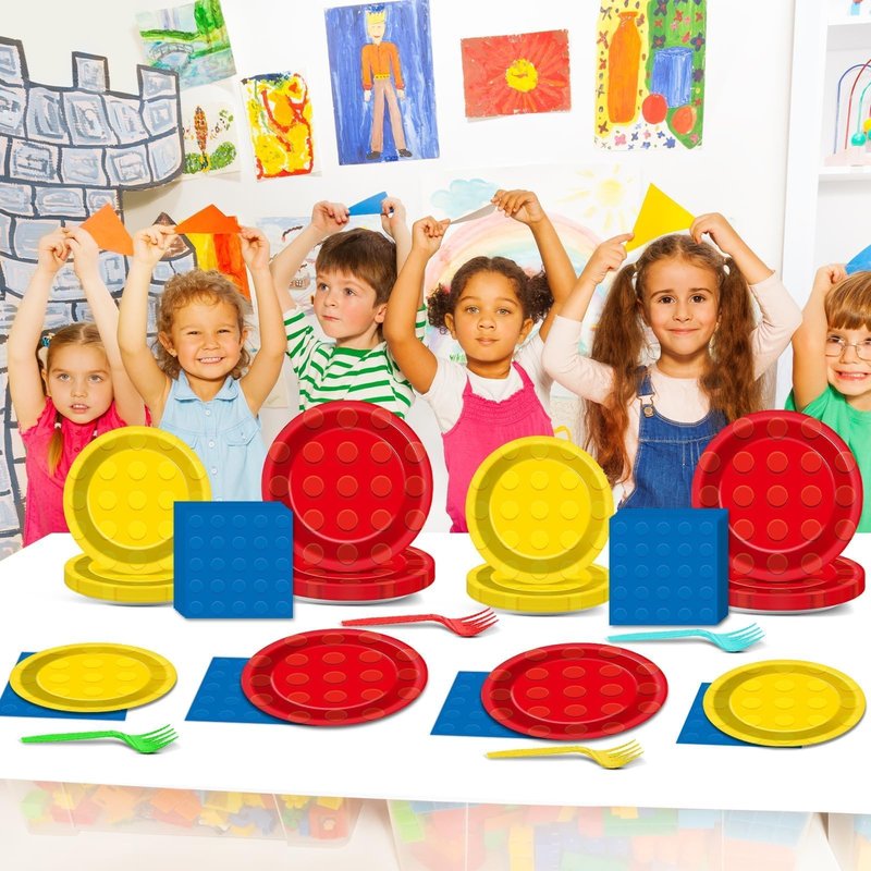 - What You Will Get: The package comes with 24 sets of building block tableware sets, including 24pcs 9inches plates, 24pcs 7inches plates and 24pcs napkins(About 6.5 x 6.5 inches folded, About 13 x 13 inches unfolded), and 24pcs forks in 4 colors(red, yellow, green and blue), totally 96pcs, each set serves for 24 guests. Sufficient quantities are enough for your party, picnic, indoor or outdoor activity.