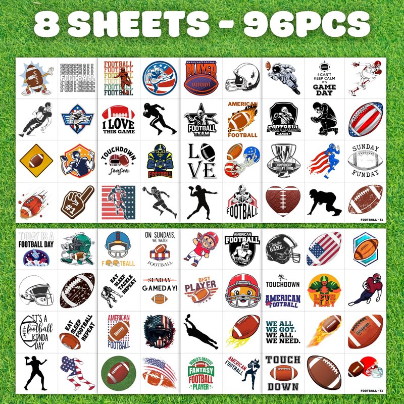 - 🏈【PERFECT TATTOOS FOR THEMED FOOTBALL DECORATIONS】: FOOTBALL temporary tattoo stickers include 8 sheets in total. There are 96 Pcs super cute tattoo differences. Perfect for giving out party favors and holiday theme small gifts. The size of each sheet is 6.3 * 4.72 inches. One size fits kids.