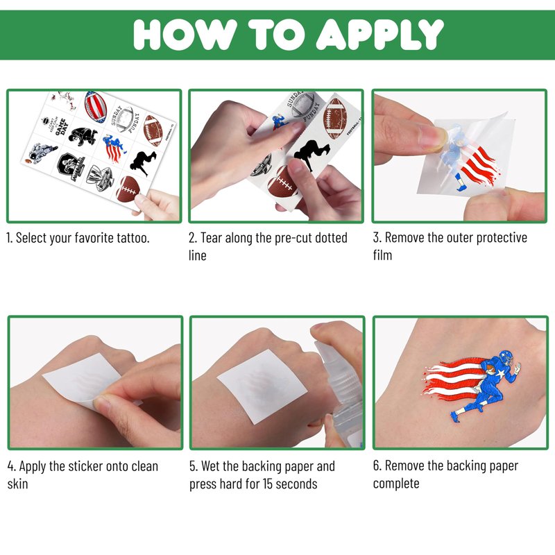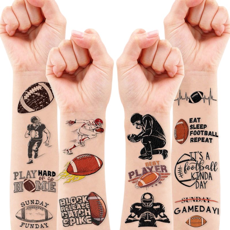 🏈【PERFECT TATTOOS FOR THEMED FOOTBALL DECORATIONS】: FOOTBALL temporary tattoo stickers include 8 sheets in total. There are 96 Pcs super cute tattoo differences. Perfect for giving out party favors and holiday theme small gifts. The size of each sheet is 6.3 * 4.72 inches. One size fits kids. 🎁【GREAT GIFT IDEAS FOR FOOTBALL PARTY SUPPLIES AND DECORATIONS】: You will receive many compliments when you decorate your child's birthday party with a FOOTBALL, Sport Game Player Summer Olympic theme. FOOTBALL tattoos are a small gift you should not pass up for your kids. 🌍【SAFE AND ENVIRONMENTALLY CONSCIOUS】: Our temporary tattoos are made from materials that are safe and prioritize sustainability. These tattoos are created using paper that is both safe for users and friendly to the environment. 🥳【ADD A TOUCH OF FUN】: Are you tired of mundane gifts? We've got you covered! Our collection of adorable and vibrant temporary tattoo designs can be applied to laptops, backpacks, desks, suitcases, books, water cups, and more. These playful elements will surely elevate your visual experience and bring a touch of joy to everyday items. 🌴【EASY TO USE AND REMOVE】: Cut each tattoo out of sheets and remove the sheet clearly. You can stick it on your hands, face, arms or wherever you feel safe. Moreover, you put it down on glasses, clothes, and a smooth flat . After that, you wet it thoroughly with water and wait for 20-30 seconds, you get rid of the backing paper. As a result, you have a velvety tattoo as we say. 👍【PERFECT SERVICE】: If you have difficulty using our product, contact us. We will make sure to solve problems and help you have a wonderful buying experience. 🙉【 Not recommended for people with a history of sensitive skin, if symptoms appear, stop using immediately】 ⚠️This product is not recommended for individuals with sensitive skin. We advise testing the product on a small patch of skin, such as the hand, to check for any allergic reactions to the ingredients before applying it to other areas of the body