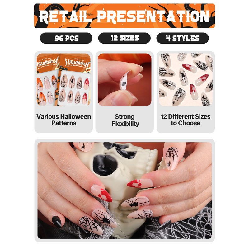 - Our Halloween press on nails come in different sizes, so you can choose the suitable size to fit your every finger.