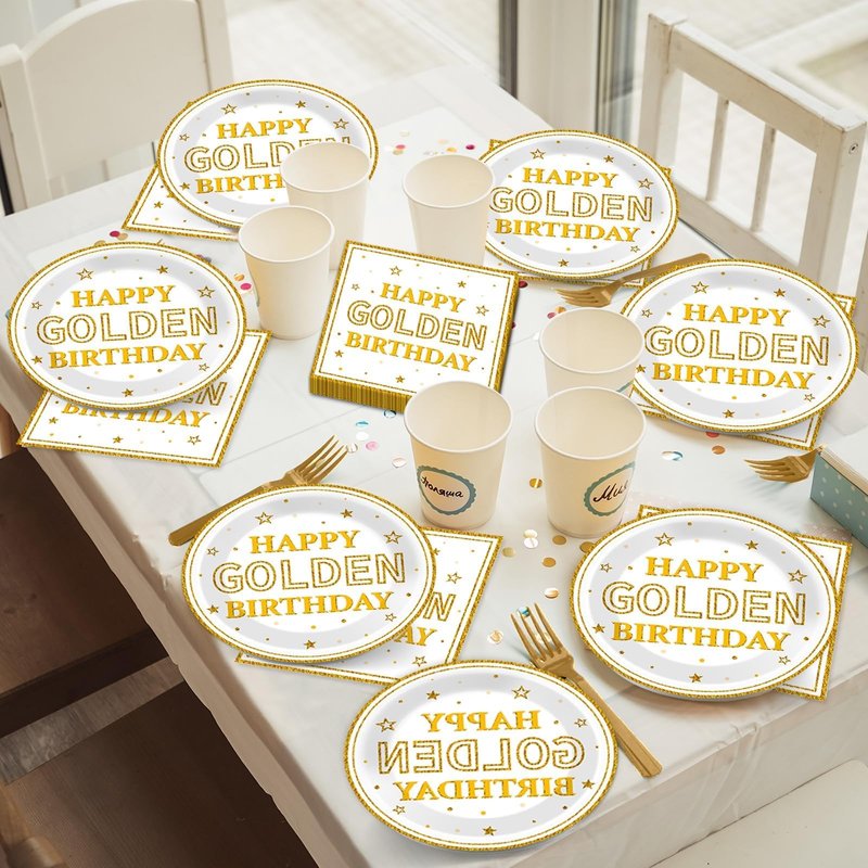 - Save your time: No wash up. Save your time on cleaning. You just need to throw this happy golden birthday tableware set into the trash can after the golden birthday party. You can spend more time playing with your friends and families.