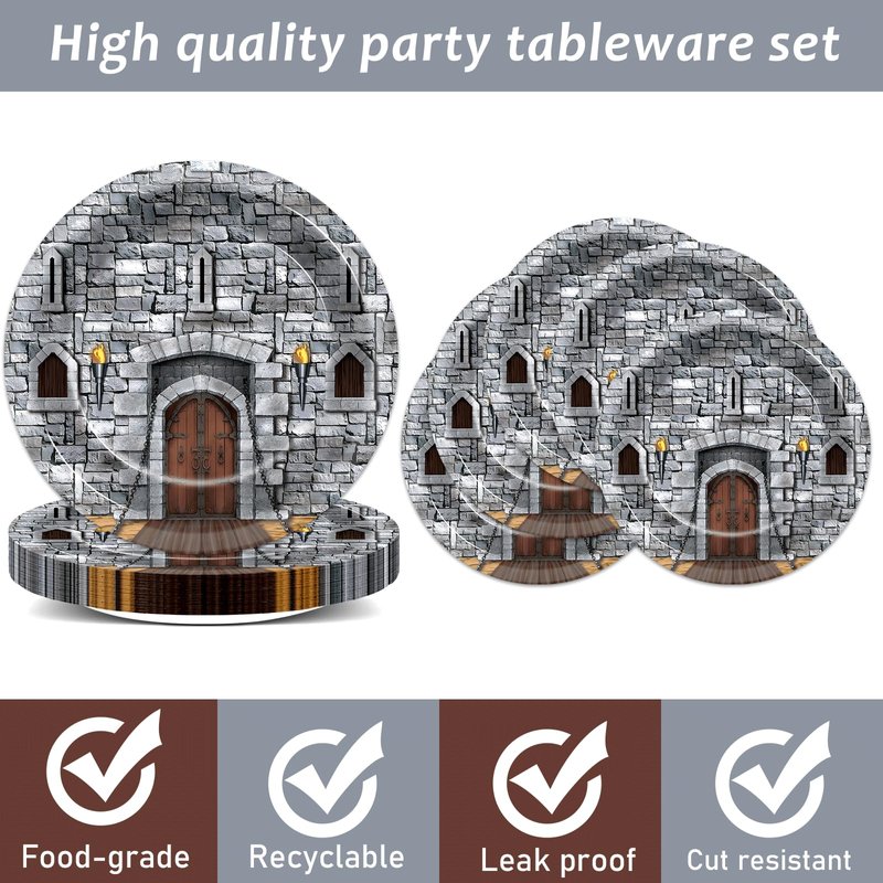 - Exquisite design: The medieval scene castle tableware set features an authentic medieval castle scene with tall city walls, city gates, and a drawbridge pattern. The rustic stone wall design brings a retro, medieval atmosphere to any party, enhancing the medieval party decor.