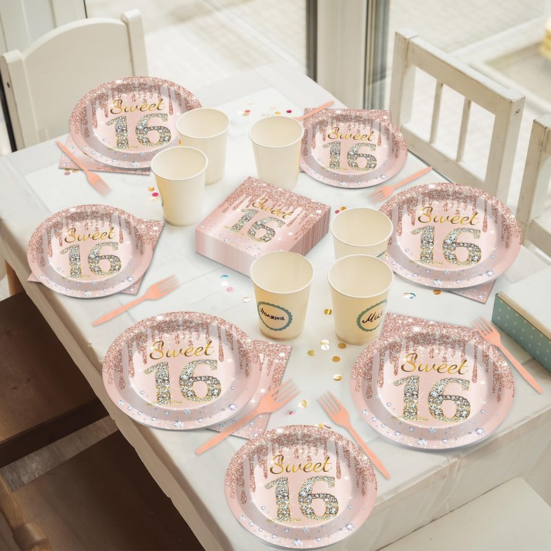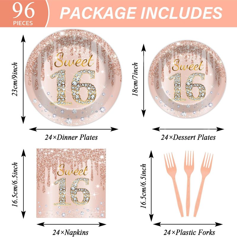 - Serves 24 Guests:This rose gold sweet 16th birthday party tableware supplies includes 24 paper plates (7"),24 paper plates (9"),24 napkins (6.5") and 24 forks.The Sixteenth birthday party plates and napkins can serve for 24 guests.