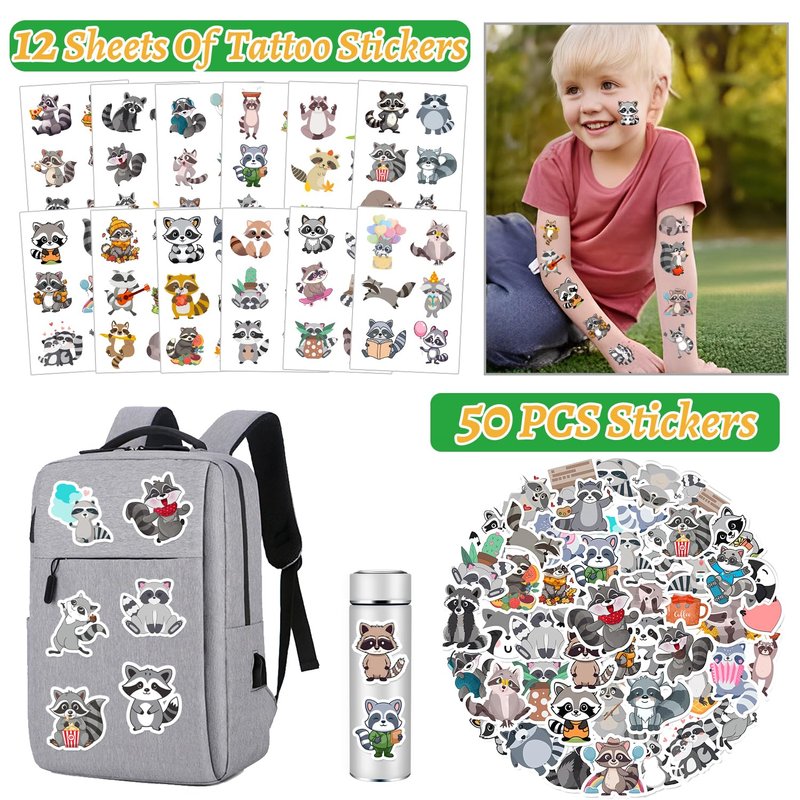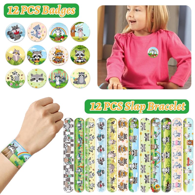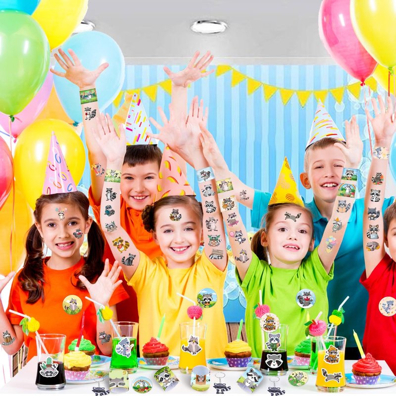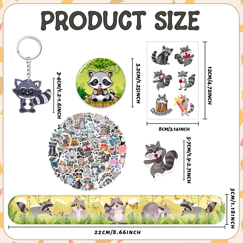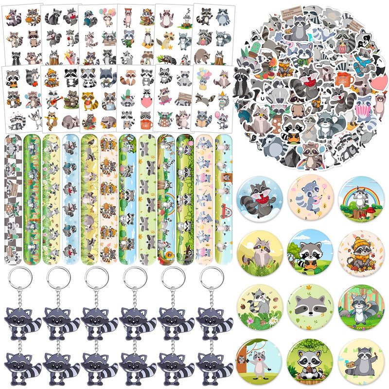 - Package Include: The raccoon party favors contain 50 pcs raccoon stickers, 12 sheet raccoon temporary tattoos(72 patterns), 12 pcs raccoon slap bracelets, 12 pcs raccoon keychains, 12 pcs raccoon badges, Enough quantity to meet your raccoon party needs