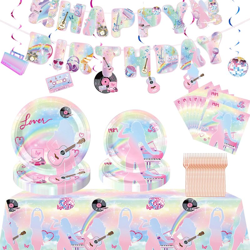 - Set includes: The birthday party decoration set includes 1 pcs Happy birthday banner,1pc tablecloth, 6 pcs hanging swirls, 24 pcs party dessert plates 7 inches, 24 pcs party plates 9 inches, 24 pcs napkins , 24 pcs forks, each set can serve 24 guests