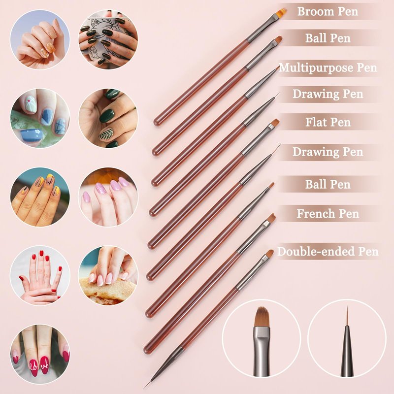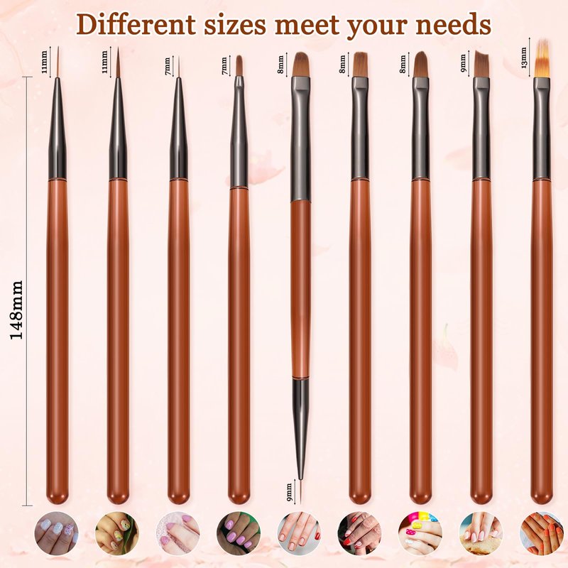 - COMPLETE PACKAGE: Our 9PCS nail art brush set offers versatility with a gel round nail brush, flat nail brush, French bevel nail brush, dual-ended nail brush dotting pen, nail art liner brush, nail ombre brush, and more. Convenient to do crafts, painting, and pointing drills to meet diverse creative desires