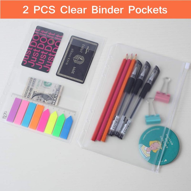 - Clear Binder Pockets: Totally 4 Pockets, PVC material, waterproof and durable to keep pens, bill, money, vouchers, name card, credit cards, ID card or small office supplies tidy and organized, and protect and store them without hole punching. Clear view for quick and easy identification