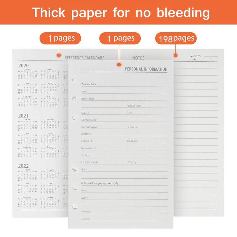 - A5 Binder Paper: Totally 100 Sheet/200 Page with 7mm ruled loose leaf paper, off-white, thick lined paper for writing pens without bleeding through or feathering. Personal information page and 2020/2021/2022 calendar page for planner notebook