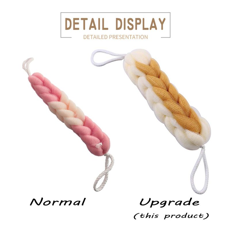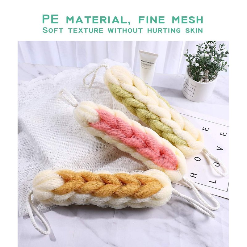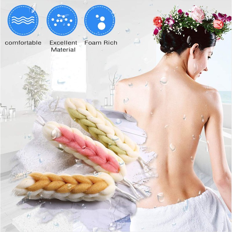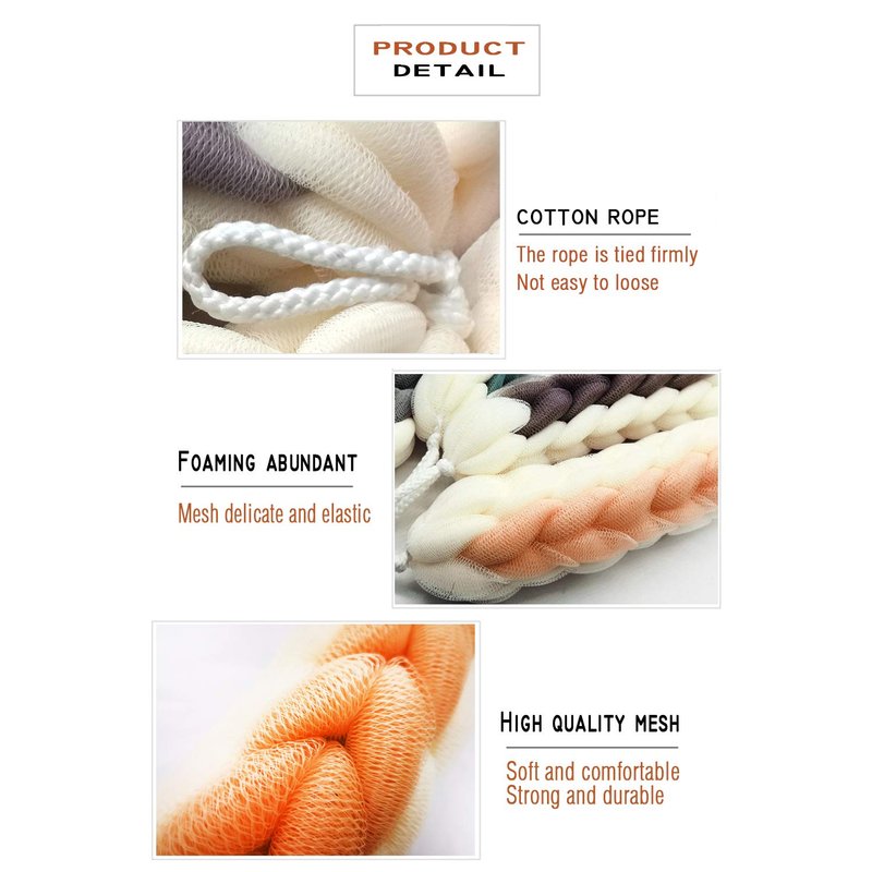 - ✔️USE FLEXIBLE: The mesh of bath sponge was soft and durable enough to used on the most delicate skin. would never scratch your skin. It also can effectively clean the skin and dirt. The braided loofah rope is perfect for cleaning the back, neck, shoulders, feet and hard to reach areas. The durable shower sponges are not easy to fall apart.