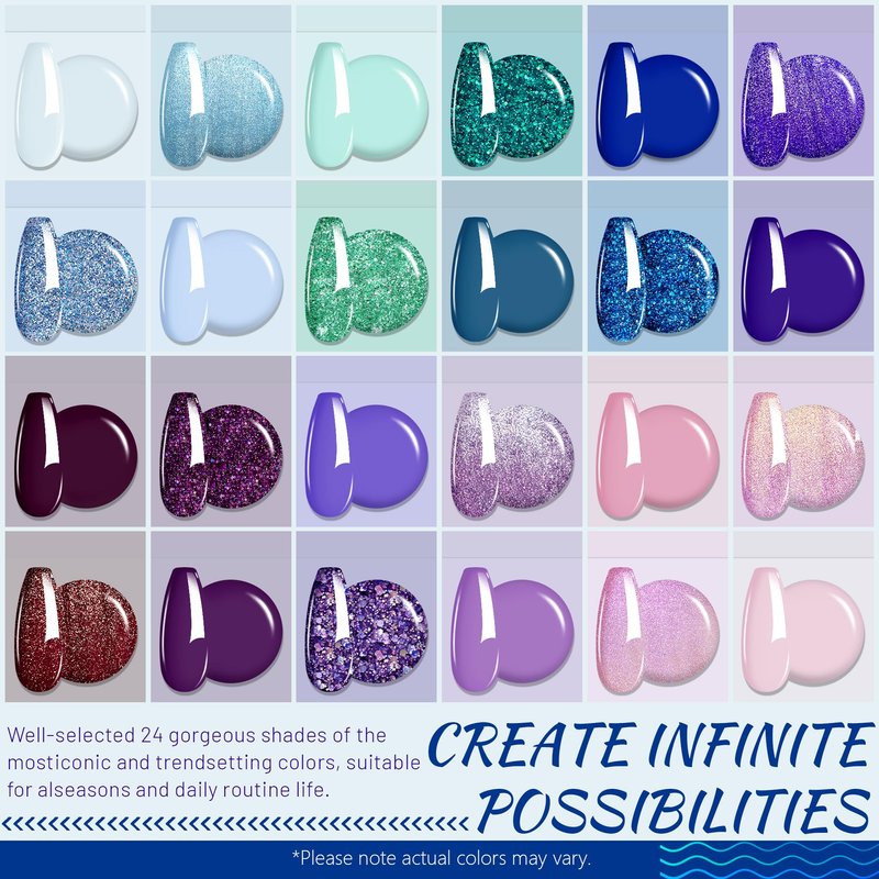- 🌼【Tiny& Compact& Storable】: The purple blue solid sel polish palette for easy storage does not occupy space, say goodbye to the clutter; Tiny but worthy: 24 colors in 1, more color choices. Ideal for worldwide travel. # NOTE: Need Base&Top Coats, and Lamp Curing! #
