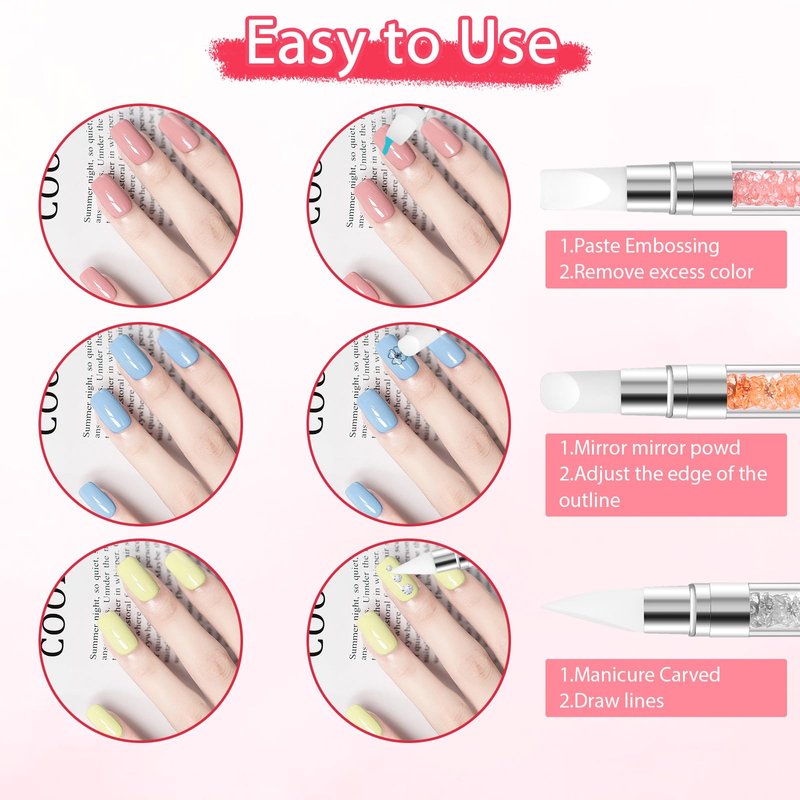 - Wide application: This silicone nail tools is not only suitable for all kinds of nail polish, but also can complete various nail art tasks, such as: Wiping magic mirror powder, adjusting gel, pressing stickers, carving, wiping gel overflow, drawing patterns, pasting diamond shapes, pasting sequins with silicone pens, etc. This silicone nail tools for nail art brings more convenience to your nail art design.