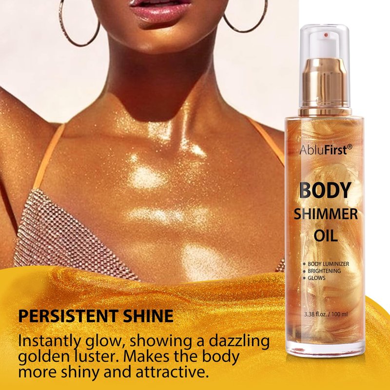 AbluFirst Shimmer Body Oil 100ml Summer Body Glitter Moisturizing Light Shimmer Glow Non-Sticky Summer Body Luminizer and Illuminator Smooth (3.38 Fl Oz (Pack of 1), Gold)