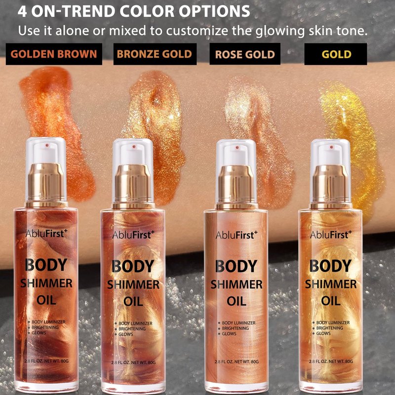 AbluFirst Shimmer Body Oil 4 Colors. This glowing oil is easy to apply on the skin, moist but not greasy. Can not only be applied to various parts of the body, but also to your face, making you shine and shine brightly. Suitable for parties, beaches, summer outdoor activities, and more. Of course, it can also be used as a sincere gift.