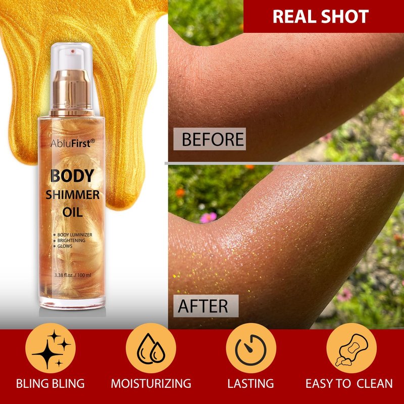 - Natural Moisturizing ingredients: Made of natural moisturizing formula, refreshing and non-greasy. liquid shimmer body oil is lightweight and provides continuous hydration. It spreads very easily on the skin and does not cake. It keeps skin glowing without clogging pores or settling into fine lines.