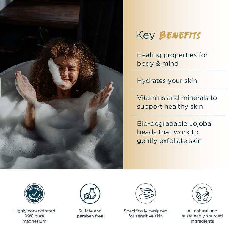 - HIGHLY CONCENTRATED 99% PURE MAGNESIUM enriched with goats milk and olive oil to help hydrate skin. Enhanced with biodegradable jojoba beads to gently exfoliate leaving your skin relaxed and nourished