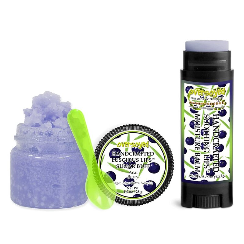 Acai Berry Soothing & Luscious Lips by OverSoyed Exfoliator & Chapped Lip Repair Lip Care Combo | Artisan Handcrafted to Order Strawberry Raspberry Boysenberry Peach Flavored Exfoliating Sugar Lip Scrub & Lip Moisturizer Balm Gift Set
