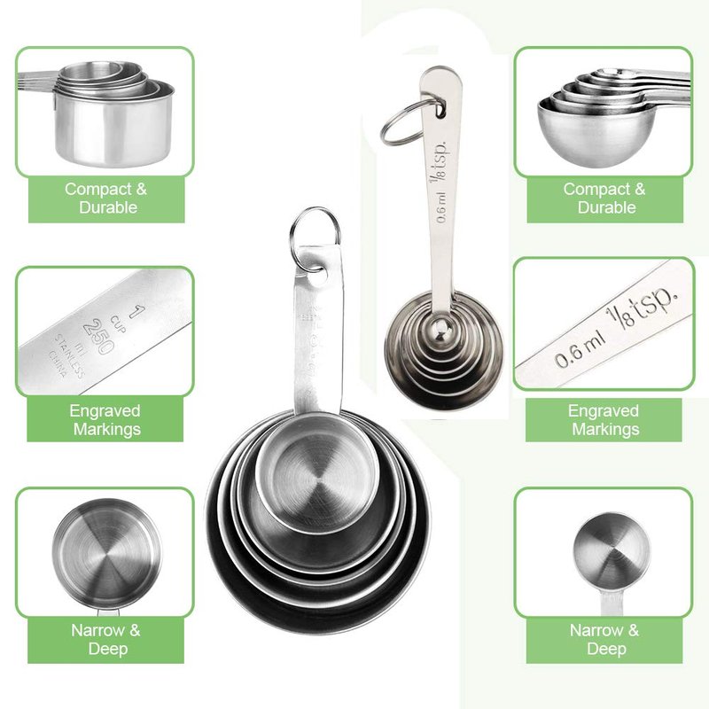 - PERFECT SPOONS or CUPS FOR MEASURING Crafted of professional gauge tablespoons includes 11 measuring sizes 1/8 tsp 1/4 tsp 1/2 tsp 1 tsp 1/2 Tbsp 1Tbsp 1/8 cup 1/4 cup 1/3 cup 1/2 cup 1 cup. With each measurement conveniently marked on the handle of each spoon ensures the measuring