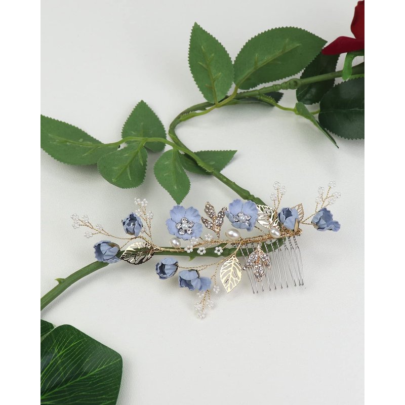 Achairder Wedding Hair Comb Blue Flower Crystal Pearl Side Combs Bridal Headpiece Wedding Accessories