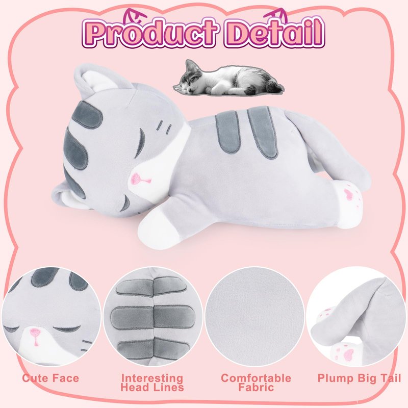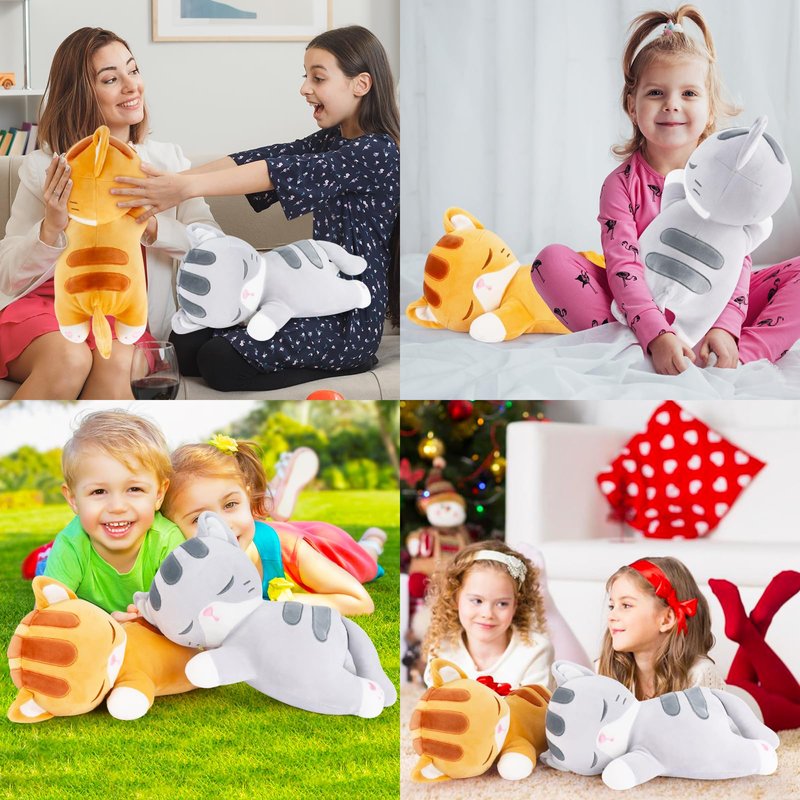- 【Saft Material】Cat plush pillow is soft and comfortable, plush animals each part of the uniform full filling, not afraid of extrusion, not easy to deformation.The fabric is made of high quality short plush fabric, which feels very good.Cat stuffed animals have ASTM F963-17 and CPSIA safety tests and get a Children’s Product Certificate (CPC). It is safe for children and is friendly to the skin. Don't worry about your child's being allergic.