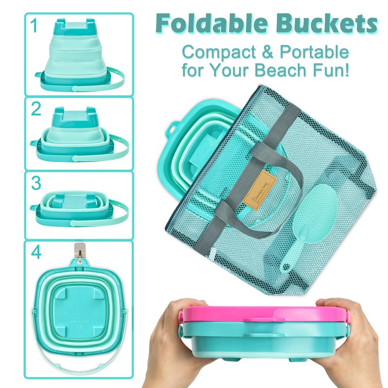 - Packable Collapsible Buckets - Perfect for beach fun on-the-go, these collapsible sand toy buckets are lightweight, fold flat, and easy to carry. They are great for kids' sandy adventures, ensuring convenience and enjoyment