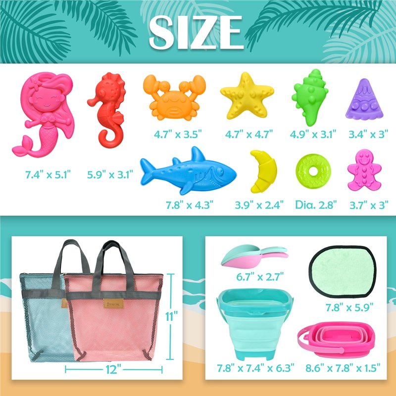- Travel-Friendly Beach Toy Set - Designed to save precious space in your luggage, this set includes 2 collapsible sand buckets, 2 shovels, 10 molds, 1 sand remover mitt, and 2 mesh beach bags. Effortlessly pack, carry, and bring them along on exciting beach adventures