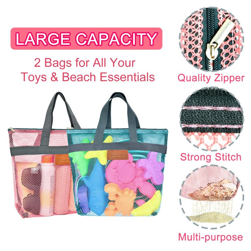 - Convenient Zippered Mesh Bags - The kit includes 2 tote carry bags that make it easy to store and transport your toys and beach essentials. The mesh fabric allows sand to shake out effortlessly, making it great for collecting shells. Cleanup is a breeze with a quick rinse