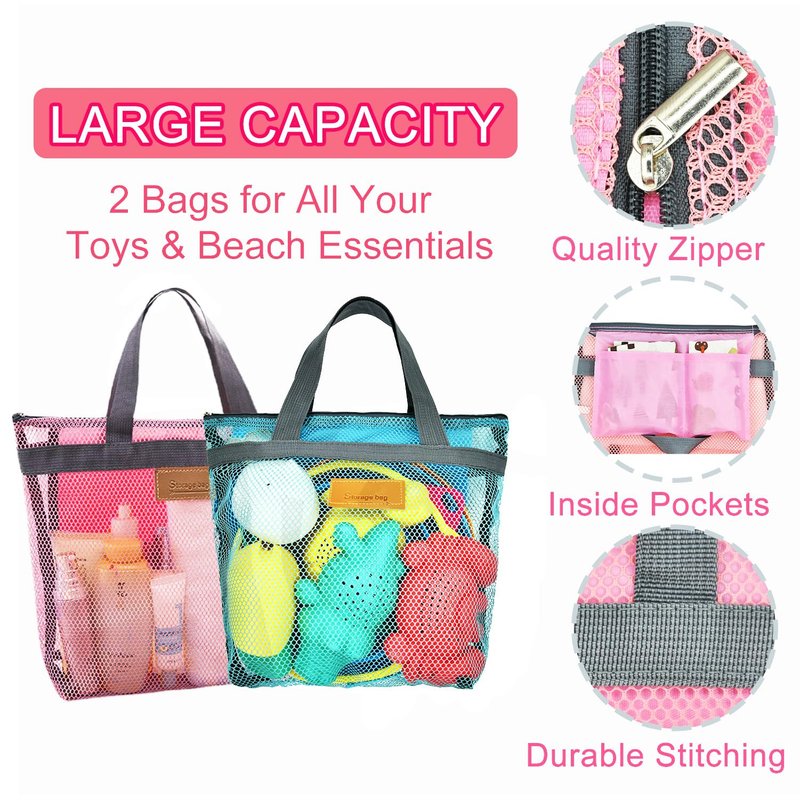 - Easy-Carry, Reusable Mesh Bags with Zippers - The kit includes 2 large mesh beach bags, make it easy to carry and store your collapsible beach toys. The breathable mesh fabric allows sand to shake out effortlessly, while the sturdy zipper closure keeps the toys securely in place. Made with strong stitching, these bags are built to endure frequent use
