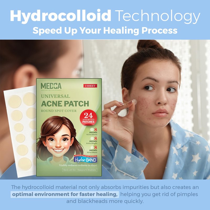 Never Let Pimples Ruin Your Day Again Introducing improved MEDca Acne Patches for Face, a complete acne spot treatment solution that includes 24 hydrocolloid patches in 3 universal sizes. Designed to cover pimples and redness, these breathable and nearly invisible patches are safe for all skin types, including sensitive skin. The high-quality hydrocolloid material gently absorbs fluids while protecting the skin without irritation. Perfect for both day and night use, these patches blend seamlessly with your skin, allowing you to treat acne discreetly. Unlike drying treatments, they keep your skin hydrated and promote optimal care. Key Features:
