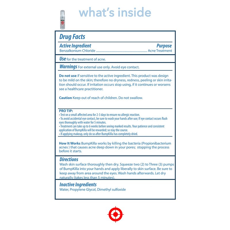 - BumpKilla Challenge - Get rid of 80% of your acne in 4 - 6 weeks or it's Free! The primary ingredient in BumpKilla is BenzalKonium Chloride. This ingredient has been approved for skin and food contact. It can be found in numerous products including mouthwashes, hand sanitizers and on condoms as a spermicide. In Bumpkilla it serves as the chief aid to stop the formation of acne. It is both safe and effective.If you have a Foamer bottle, don't forget to pickup the Refill [B07BGY28NV] and save.