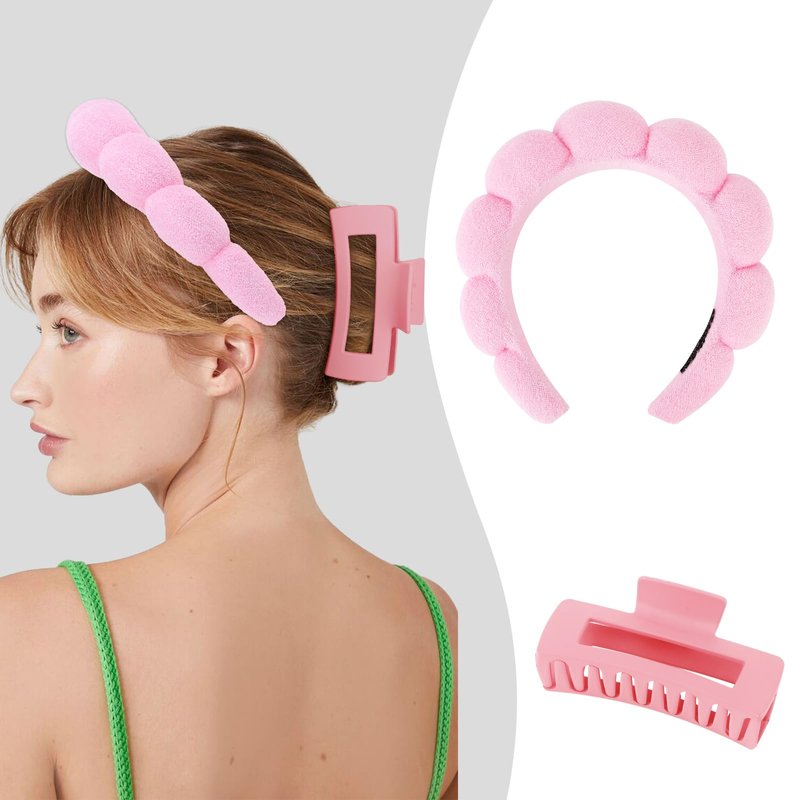 1 x makeup headband for washing face,1 pack cute claw clips/large clips for hair, 2pcs spa wristbands for washing face and 2pcs powder puffys