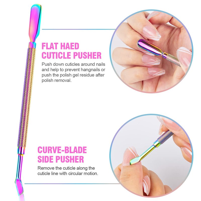 - Cuticle Pusher and Cuticle Remover - Use the flat head to gently push down the cuticles around nails and posh the polish gel residue after polish removal; Use the curve-blade side to remove the cuticle along the cuticle line with circular motion. Use the scraper head to scrape off the soaked polish and gel nail polish easily with flat and hard edge; Use sharp head to remove the dirt under the nails, or scrape away cuticle on nails end, remove the false nails.