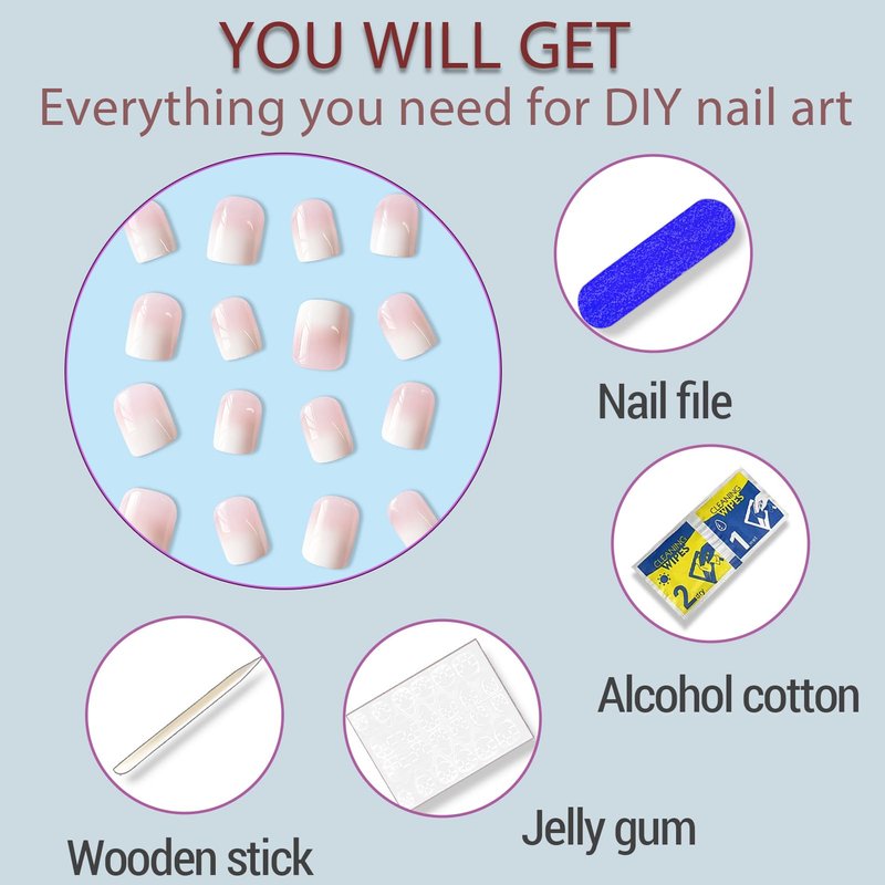 - 💖【Short false nails Package】- 24pcs/12 sizes short nails, 1 nail file, 24pcs jelly glue. (Durability of jelly glue is not as good as liquid glue, but it makes fake nails reusable,Please use suitable glue according to different scenes).