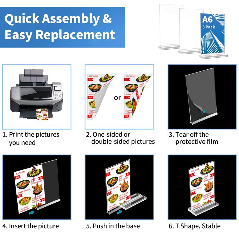 - đ¸ăDouble-sided DisplayăCompared to the backward-tilted stand, the transparent menu holder adopts a vertical double-sided design, and both sides can display and protect pictures or posters, menus, etc., and are clearly visible.