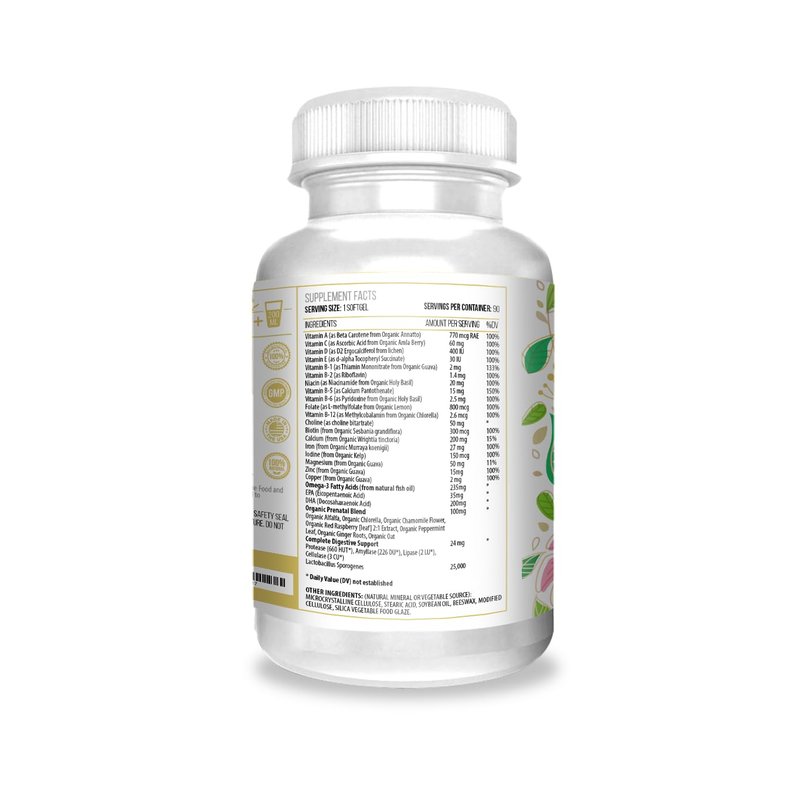 - The most complete Prenatal Vitamin Formula with 25+ Organic Vitamins, Minerals, Organic Herbal blend, DHA, EPA, Omega-3 and Choline. Full nutritional support for expecting moms throughout three trimesters.