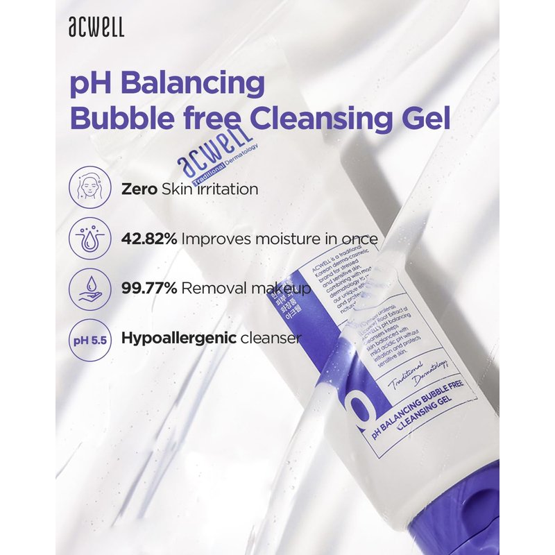 - NON-FOAMING BUBBLE-FREE CLEANSING GEL: Acwell pH Balancing Bubble-Free Cleansing Gel is enriched with 8 types of Hyaluronic Acid, Elder Flower Extract and Licorice Extract. This aqua formula helps to calm irritated and sensitive skin while deep cleansing the impurities from the pores.
