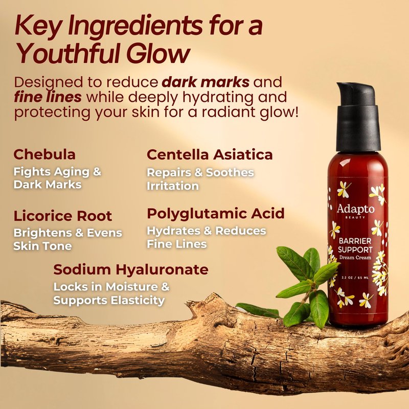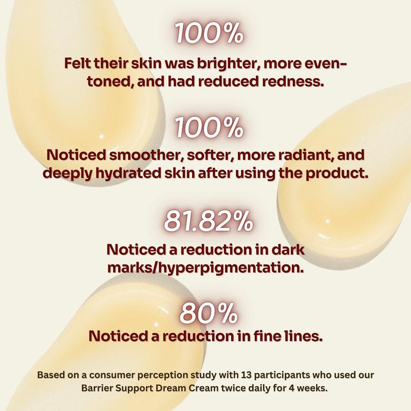 Transform your skincare routine with our Barrier Support Dream Cream, expertly formulated to strengthen your skin’s natural barrier. This luxurious cream is the perfect solution for busy, on-the-go individuals, streamlining your routine into one simple step. Key Benefits: Enhanced Barrier Function: Rejuvenates and restores your skin’s protective barrier, ensuring resilience against environmental stressors. Diminishes Dark Marks: Our powerful antioxidant-rich formula helps lighten hyperpigmentation and promote an even skin tone. Reduces Fine Lines: Experience smoother skin as the cream visibly diminishes fine lines, leaving you with a youthful glow. Intense Hydration: Provides deep, long-lasting moisture to combat dryness and irritation. Ideal for those with hectic lifestyles, this cream delivers effective results in just one step—perfect for morning and night. With consistent use, you can expect to see visible improvements in just 4 weeks, with optimal results in 12 weeks. Say goodbye to multiple products cluttering your routine and hello to a streamlined solution that works. Embrace a radiant complexion and empowered skin with our Barrier Support Dream Cream—your go-to for effective skincare that keeps up with your busy life!