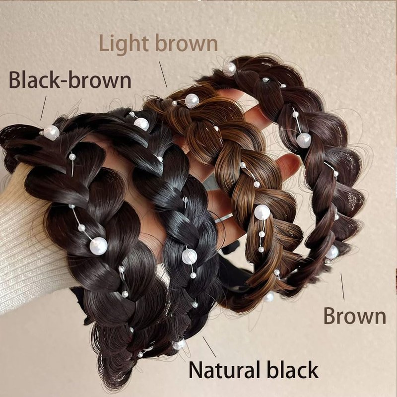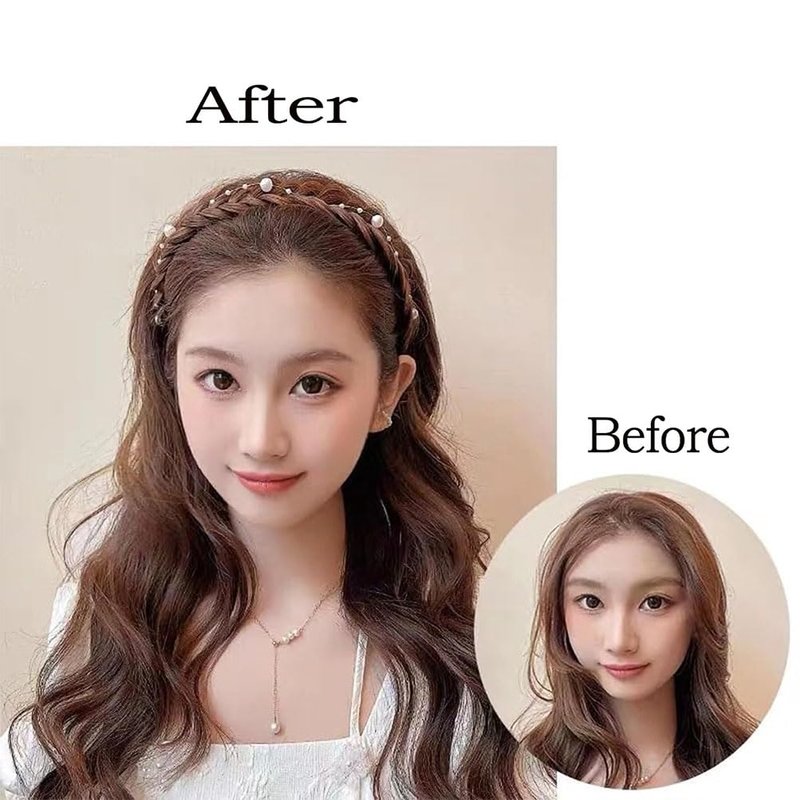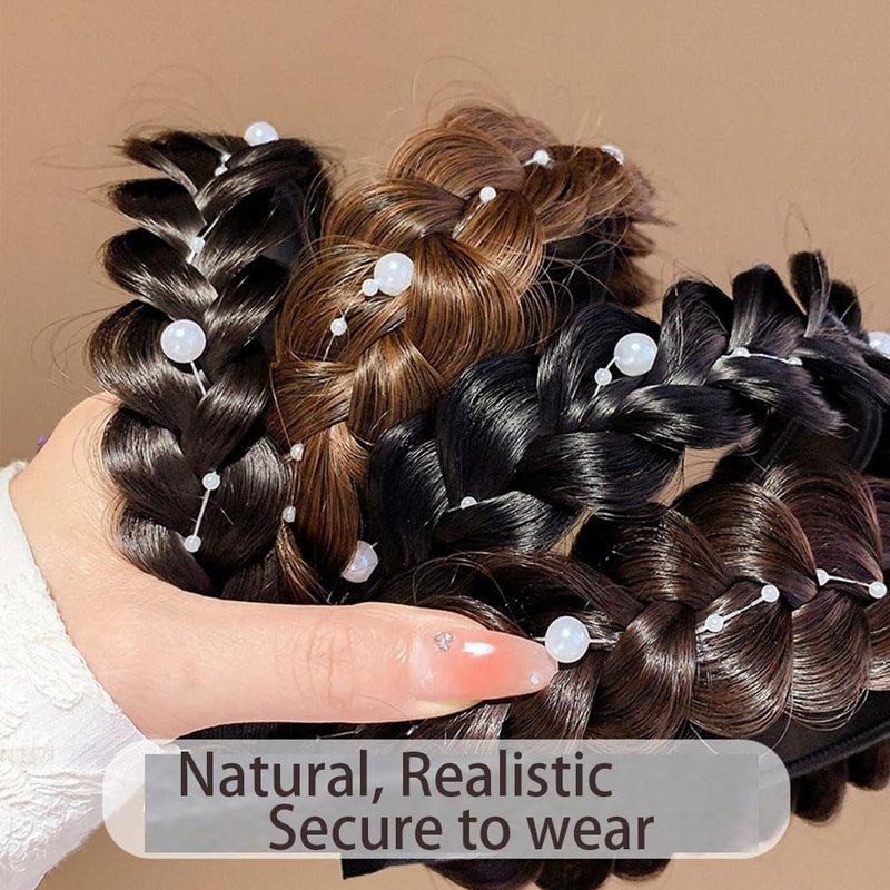 ADASTE Synthetic Hair Braided Hairband Headband Classic Pearls Plaited Hair Bands Messy Hair Stretchy Hair Accessories Fluffy Braids Wig Band for Women and Girls (Light Brown)