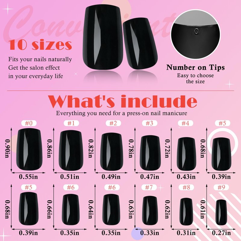 - Square Press-on Nails Medium Length Kit: This kit includes 240pcs glossy gel black press on nails in a medium square shape, 5 sheets of nail adhesive tabs, 1 mini file, and 1 wooden stick. The medium press on square nails kit provides everything you need for a press on nail manicure, making it easy to achieve a salon effect at home. The odorless medium press on nails will not harm or damage your natural nails or body