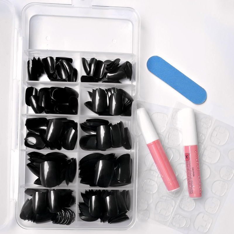- Short press on nails kit with nail glue: included 240pc/set solid colored glossy shinyblack press on nails for women girls teens kids diy nails manicure. 5 sheets adhesive glue sticky tabs, 2 nail glue, 1 mini file, come with everything you need for a quickly DIY nail art manicure, you don’t need to purchase anything else. Save your money and time