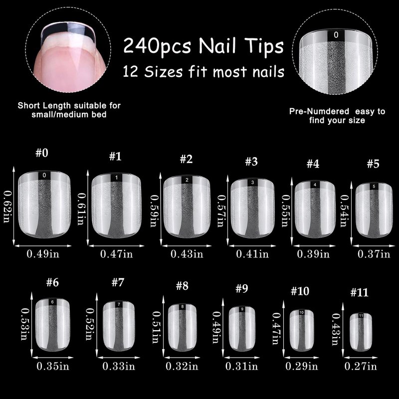 - Professional salon short square nail tips: Come with 240pcs clear xs short square nail tips, full cover acrylic gel x nails perfect for acrylic nails extension, dip powder, professional salon and home DIY manicure, press on nails making. Easier to DIY your favorite nail art effect, adding a bright color to your beauty life