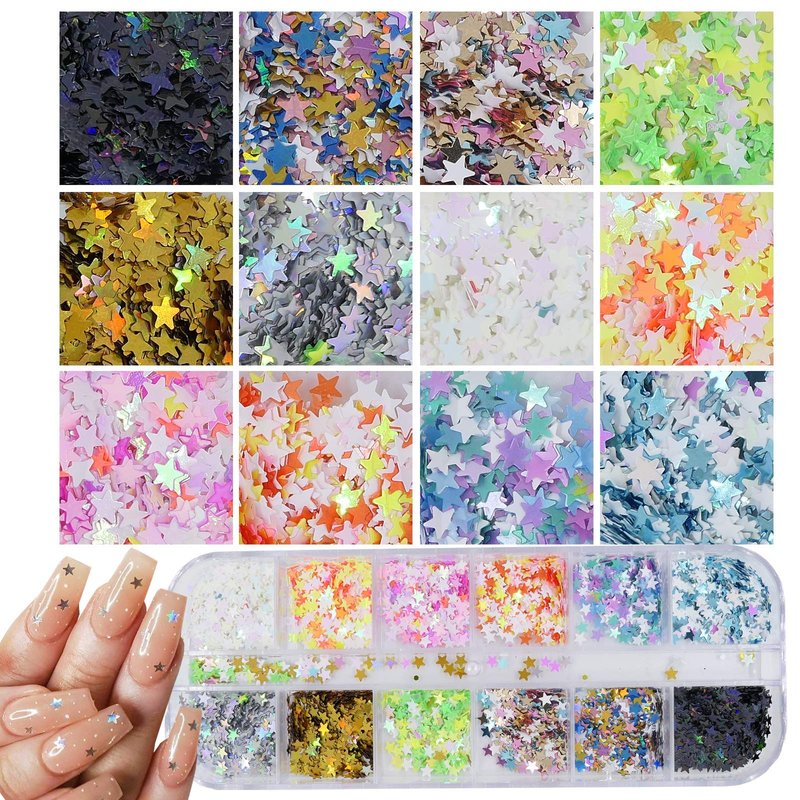 - NAIL GLITTER DECORATION KIT: 1 Box 12 colors Butterfly Nail Sequins + 1 Box Iridescent Star Nail Sequins + 1 Box 12 Color Mixed Size Round Nail Sequins + 1 Box Laser Silver Mix Shaped Chunky Glitter Nail Sequins + 1 Piece Nail Tweezers