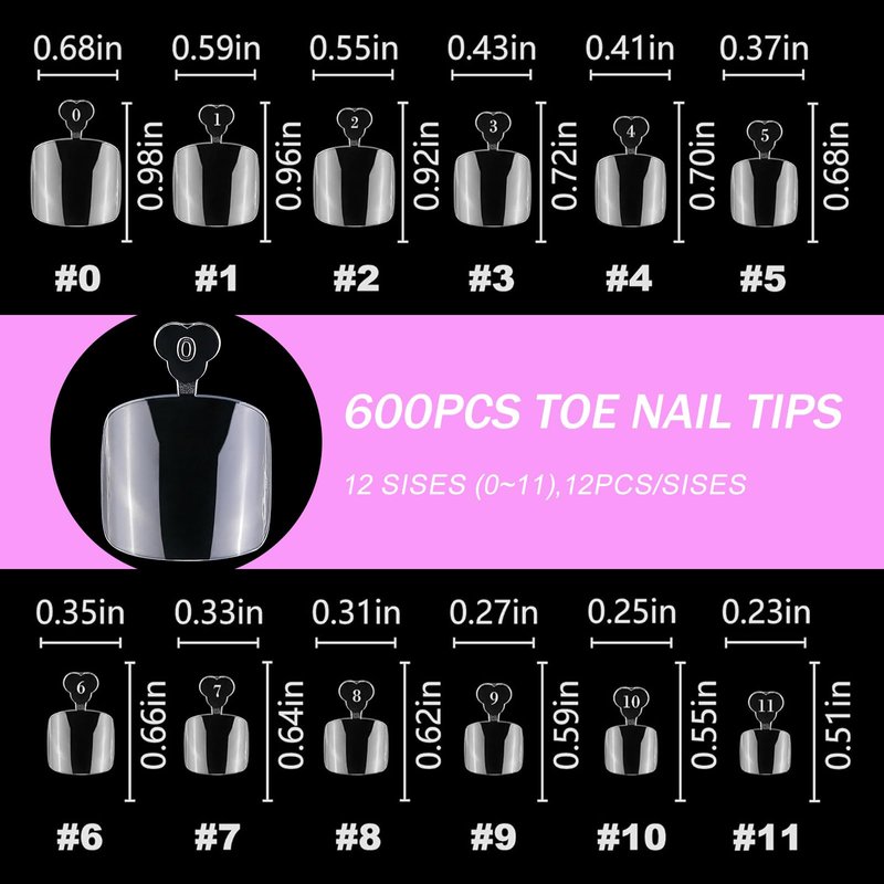 - Variety of Sizes for a Perfect Fit: The set includes 600 pieces of gel x toe nail tips in 12 different sizes (50 pieces each), numbered from "0-11." They come neatly organized in a clear box with 12 grids, making it easy to find the perfect fit for every toenail