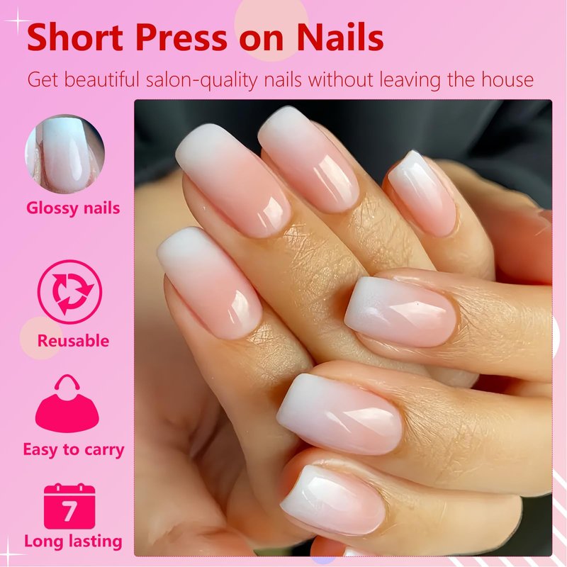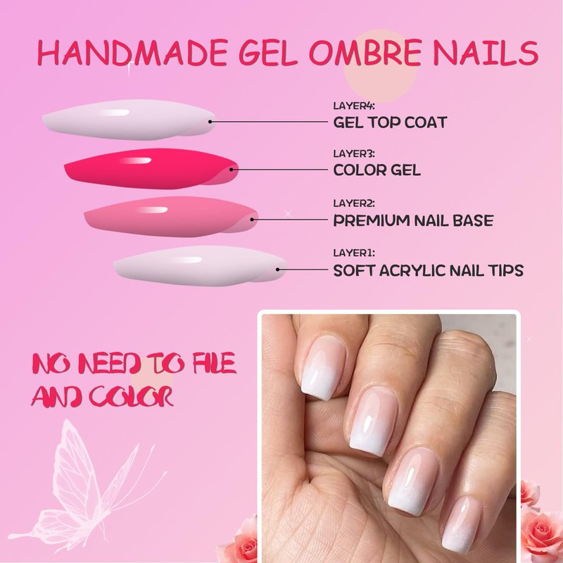 - Save your time to design: handcrafted square gel nails feature french style design, press on nails short nails are designed with classic white pink ombre color, full cover short square shape nails. And fake nails with thicker fingertips ensure your nails will not break or split! Thinner at the cuticle for a seamless look and natural looking fit, making your nails more elegant and fashionable