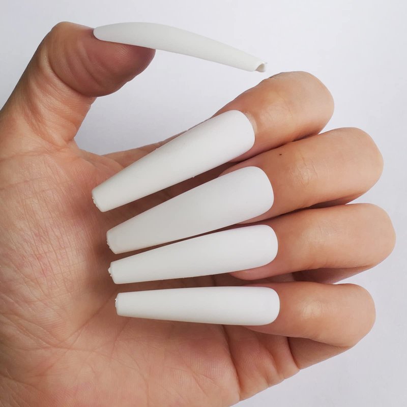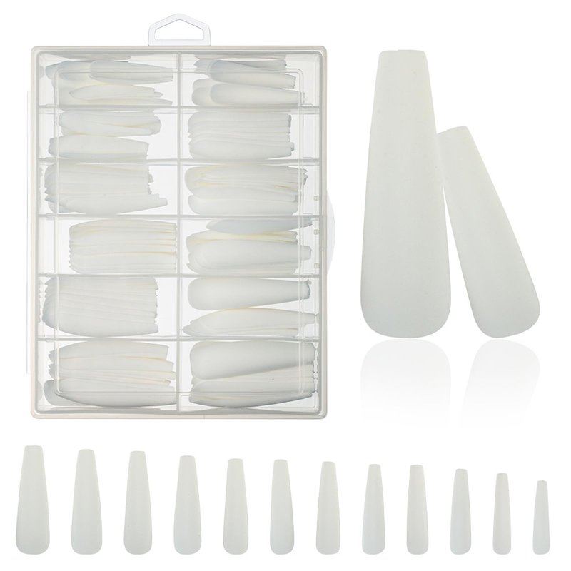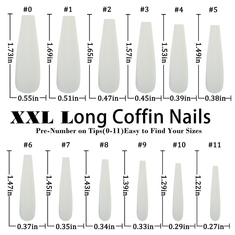 XXL extra long press on nails Qauntity:120 nail tips, 12 different sizes, fit most fingers Color: White Made of ABS material, which are durable and thick, no smell and nontoxic, will giving you a safe and comfortable nail art experience. Temporary use with adhesive nail sticker, can last up to 12 hours-72 hours, will not harm your natural nails. For long time use, please use with strong nails glue and if looked after well they can last up to 1-2 weeks Support decorations design & paint: Look more gorgeous after painting with nail polish and designing with nail glitters, sticker, decals, color polish/gel etc. Perfect Length and thickness. Easy to cut any shape you like, making your nail tips more beautiful and fashionable. Suitable for nail salons and DIY nail art at home, great gift for mother, sisters, daughter, or girlfriend who love manicure. Full nails design, Practical length, make your nails slim and have a very realistic or at least a professionally done appearance What are the benefits of press on nails? Super affordable: Save your money and time. It takes less than 10 minutes to apply Free harm: They are very easy to remove leaving no damage to the nails Pure colour, easy create your own nail salon at home with fake press-on nails How to use: 1. File the sides and cuticle area for an accurate fit with manicure stick; 2. Clean nails of any polish oil with acetone-based polish remover; 3. Select the correct size nails for each finger; 4. Apply glue to nail tips; 5. Starting at cuticle, press on & hold for 5 seconds; 6. File and shape your new nails if needed