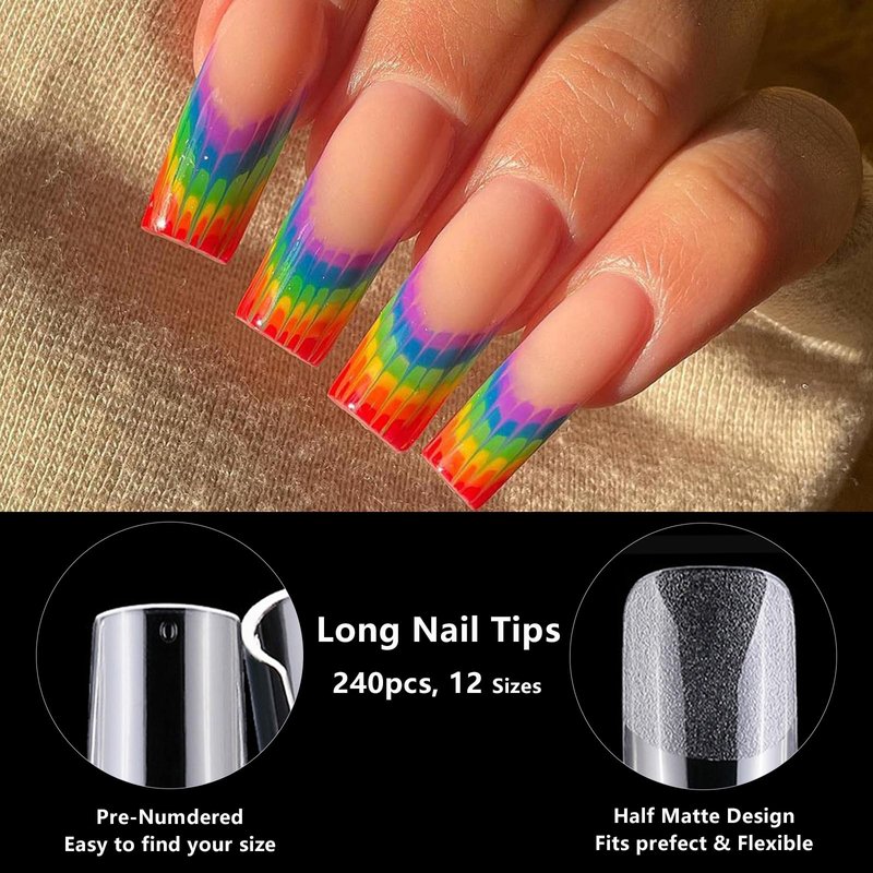 240pcs XXL extra long full cover gel x nail tips for acrylic nails, dip powder, professional salon and home diy manciure, nail extension, press on nails making