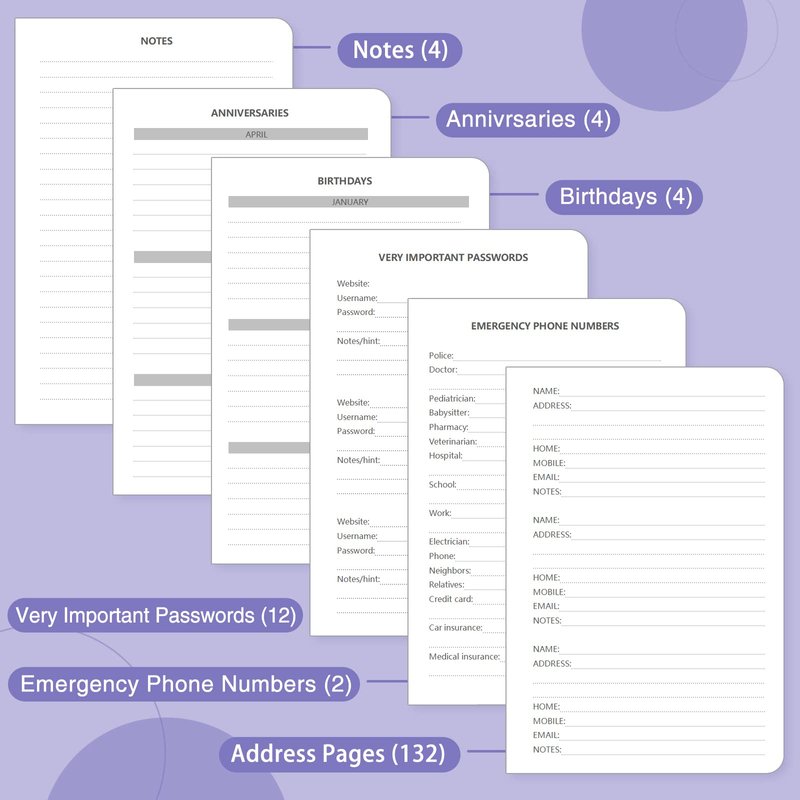 - Plenty of Room to Write:There are 132 pages (66 sheets ) of address and contact pages, for a total of 396 entries. Additional EMERGENCY PHONE NUMBERS 2 Pages, VERY IMPORTANT PASSWORDS 12 pages, BIRTHDAYS 4 pages, ANNIVERSARIES 4 pages, NOTES 4 pages. Keep everything organized in one place.